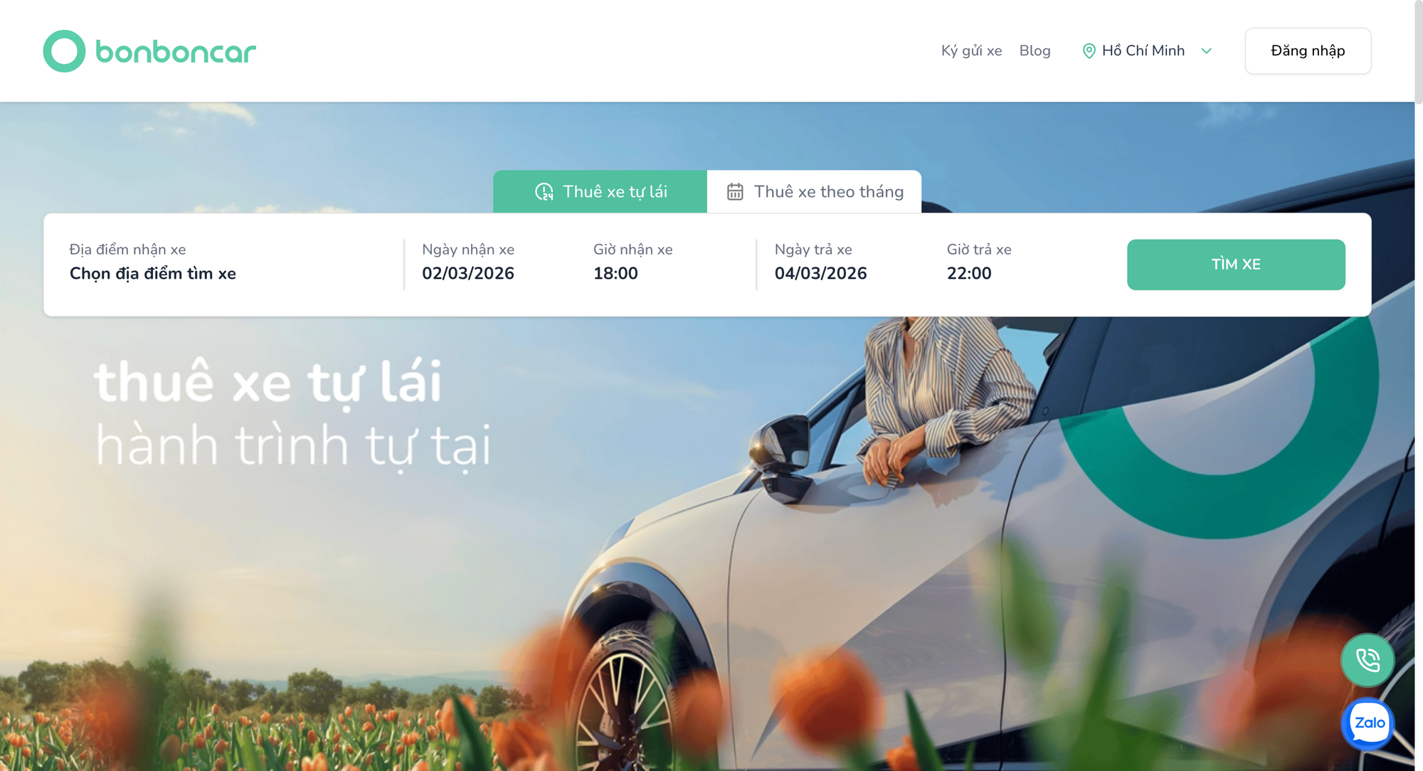 Tại giao diện chính, bạn nhập địa điểm nhận xe, thời gian thuê (4h, 8h, 12h hoặc 24h) và loại xe mong muốn như xe 4 chỗ, xe 7 chỗ hoặc xe điện tự lái. Hệ thống BonbonCar sẽ tự động hiển thị danh sách xe khả dụng kèm giá thuê, đời xe, hình ảnh thực tế và thông tin chi tiết.