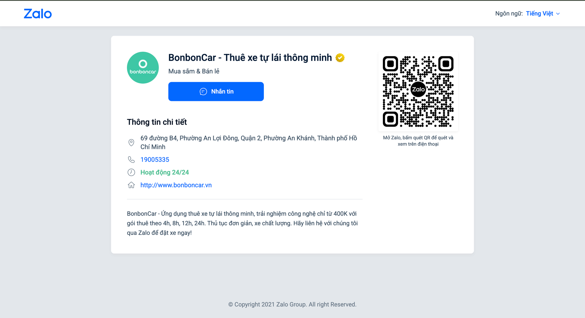 Bên cạnh website và Facebook, BonbonCar còn sử dụng tài khoản Zalo Official với tên “BonbonCar – Thuê xe tự lái thông minh” để hỗ trợ khách hàng. Đây là kênh liên lạc giúp người dùng dễ dàng trao đổi, đặt câu hỏi và nhận tư vấn trực tiếp liên quan đến BonbonCar.