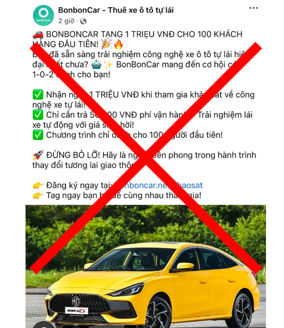 Quảng cáo “BonbonCar tặng 1 triệu VNĐ tiền thuê xe, chỉ cần chuyển 50.000 VNĐ phí nhận quà”. Sau khi chuyển tiền, người dùng bị chặn liên lạc.
