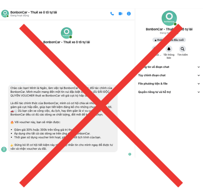 Dưới đây là những hình thức lừa đảo mạo danh BonbonCar phổ biến mà khách thuê xe và chủ xe cần đặc biệt cảnh giác. BonbonCar không liên quan và không chịu trách nhiệm đối với bất kỳ hành vi mạo danh nào.