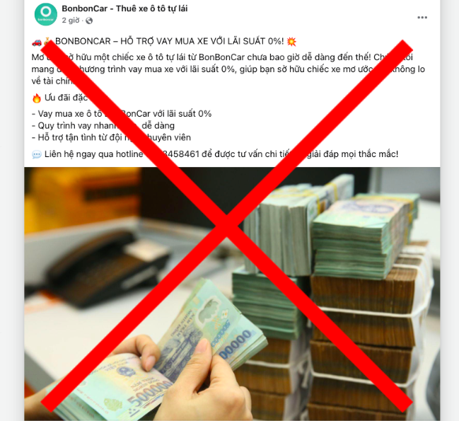 Quảng cáo “BonbonCar hỗ trợ vay tiền mua xe”, “rút tiền mặt thẻ tín dụng qua BonbonCar” với lãi suất ưu đãi, yêu cầu cung cấp thông tin ngân hàng.
