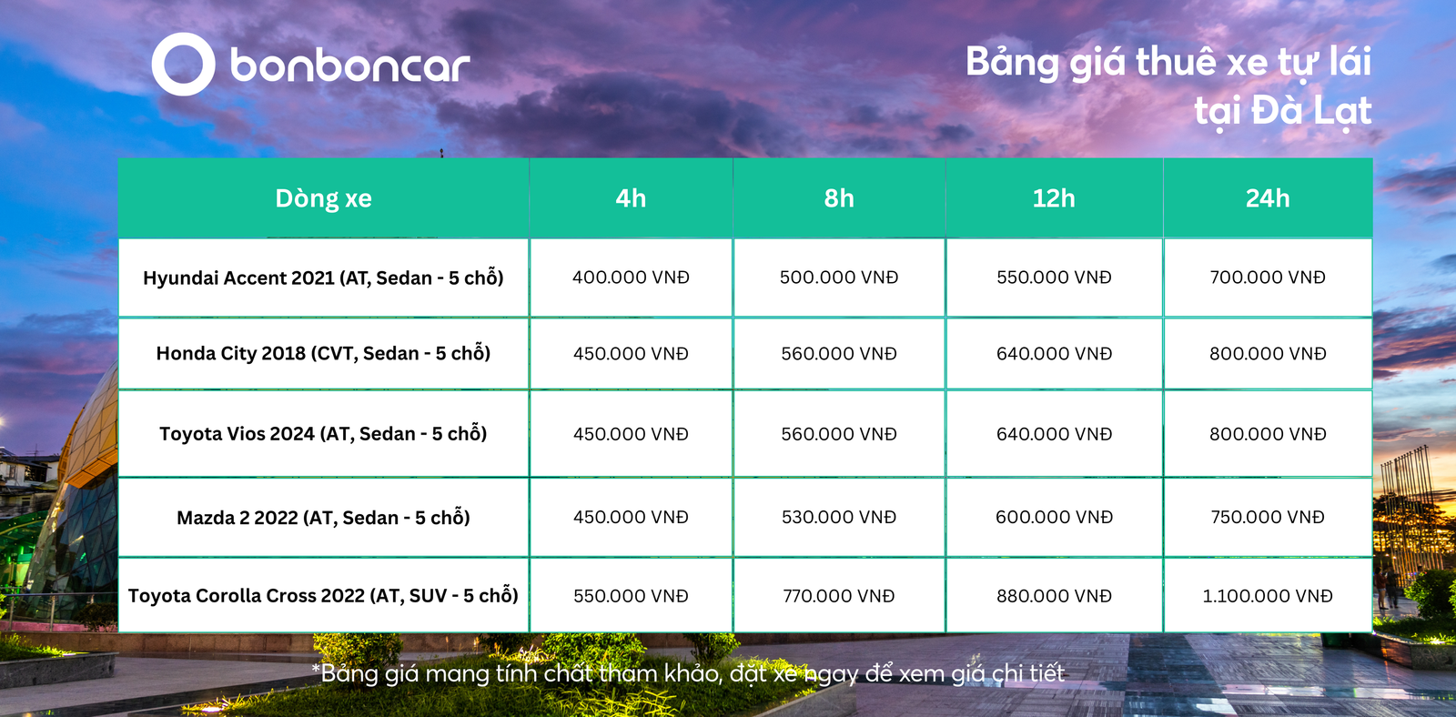BonbonCar cung cấp các gói thuê theo giờ cực kỳ tiện lợi. Dưới đây là bảng giá chi tiết thuê xe ô tô tại Đà Lạt:
