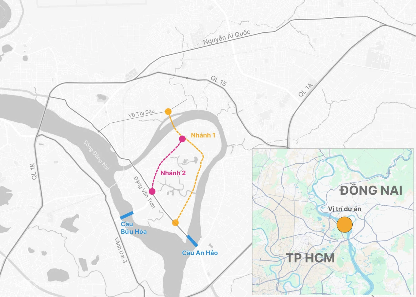 - Nhánh 2 dài hơn 1,7 km, xuất phát từ vòng xoay giao với nhánh 1, kết thúc tại đường Đặng Văn Trơn, khu vực đầu cầu Bửu Hòa, tiếp tục mở rộng hướng kết nối liên đô thị.