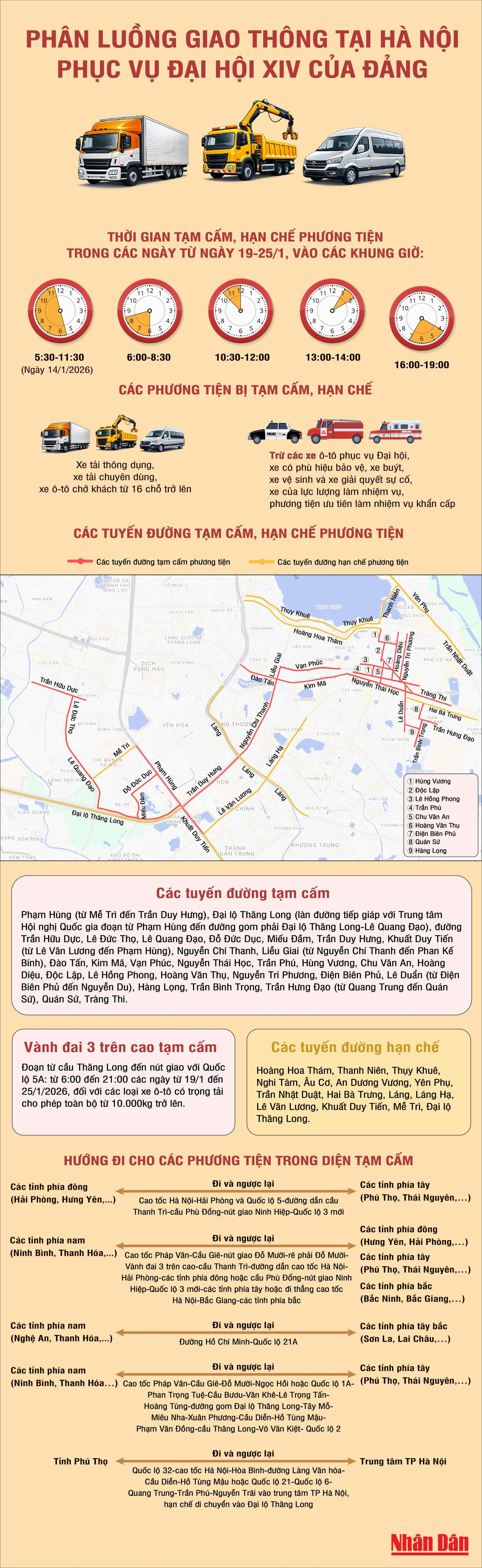 Ngoài các ngày tổ chức chương trình nghệ thuật, trong thời gian từ 19/1 đến 25/1, Hà Nội sẽ tạm cấm xe tải và ô tô chở khách từ 16 chỗ trở lên vào nhiều tuyến phố trung tâm theo từng khung giờ nhằm phục vụ Đại hội đại biểu toàn quốc lần thứ XIV của Đảng.