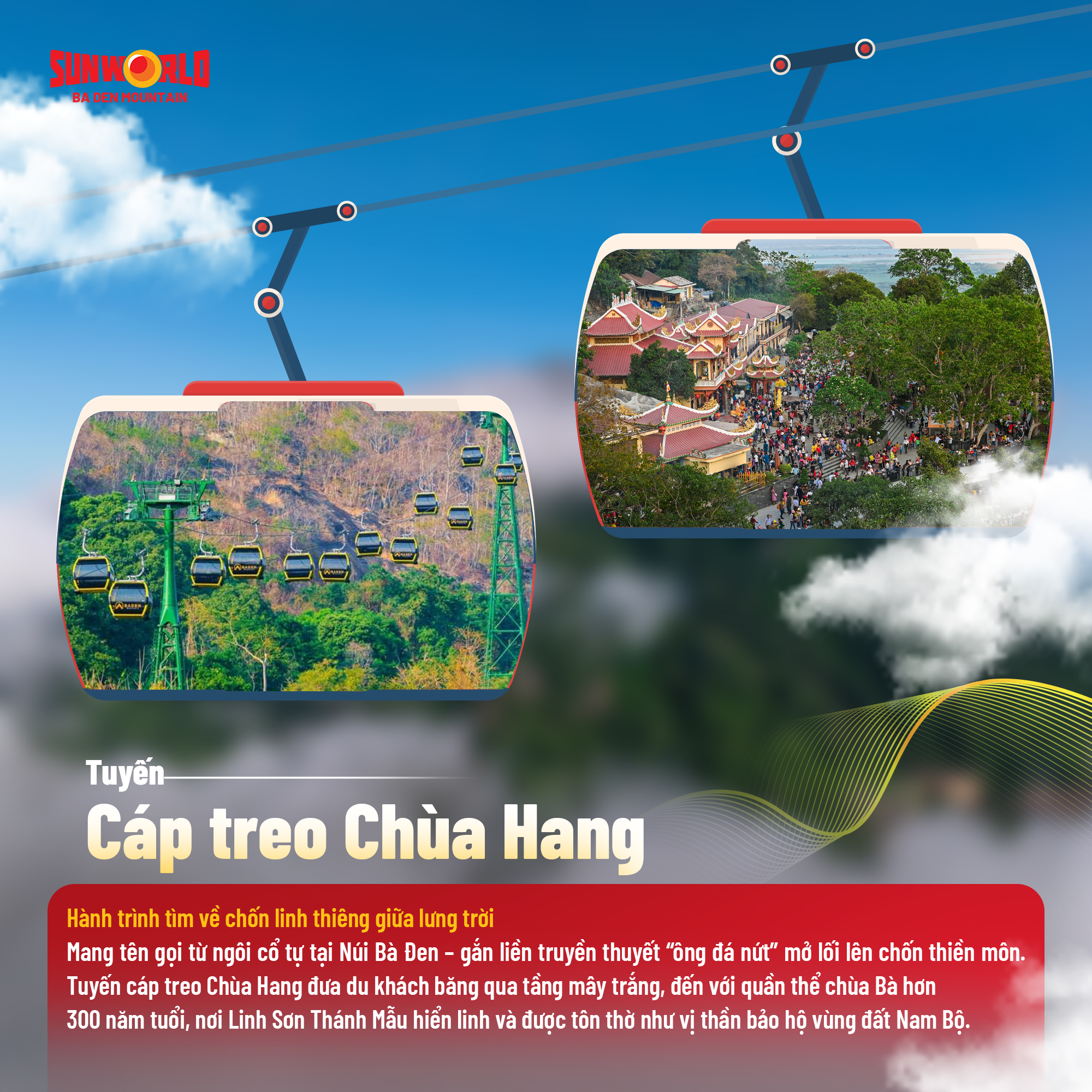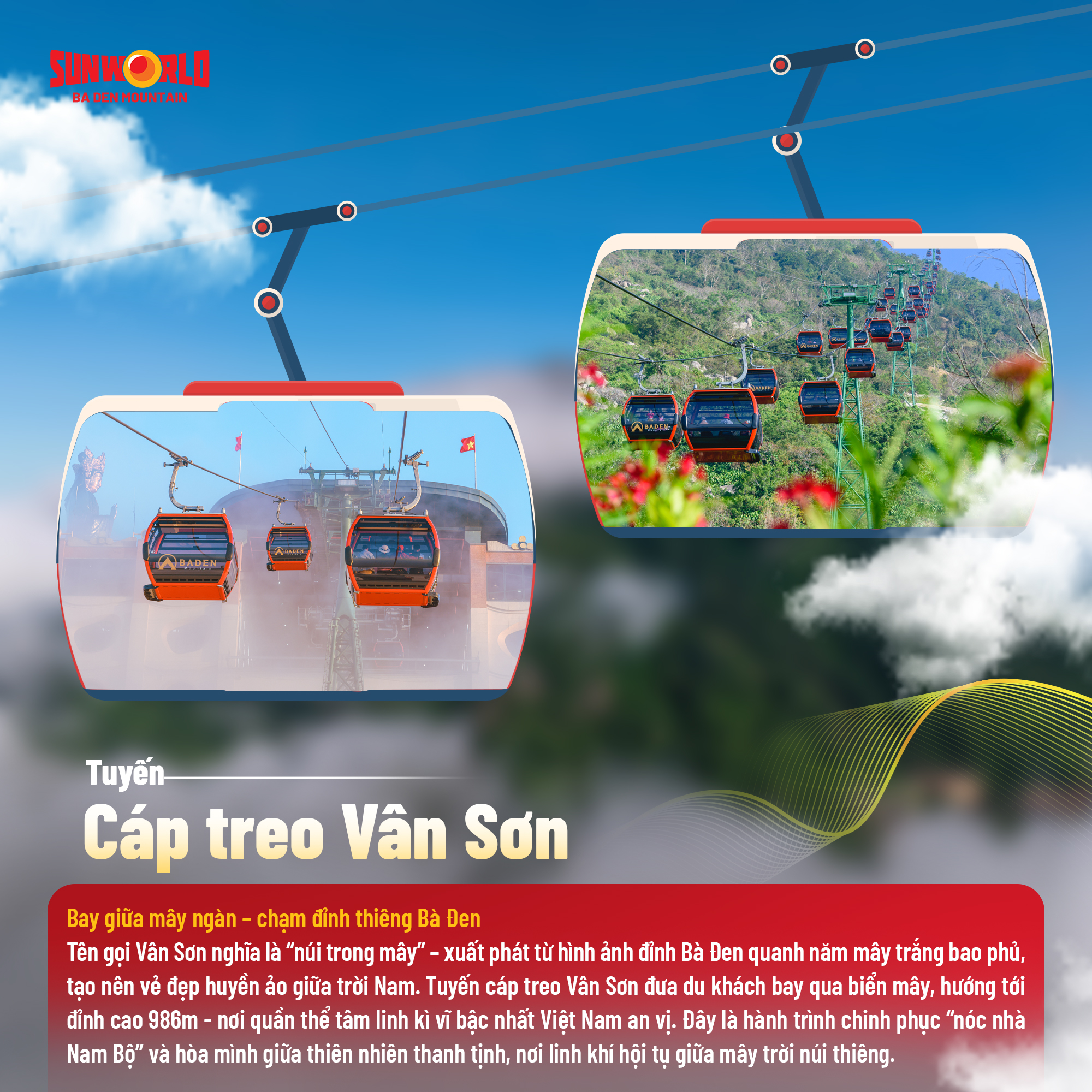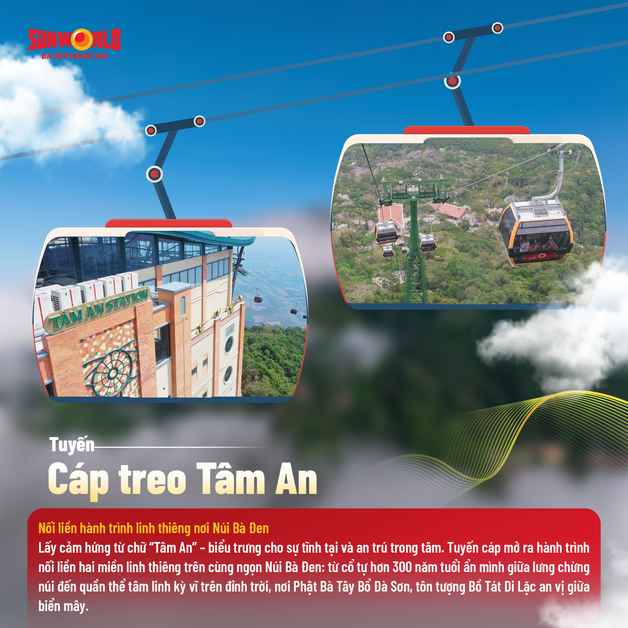 Cáp treo Núi Bà Đen – một trong những trải nghiệm thu hút nhất tại Tây Ninh – tiếp tục là lựa chọn hàng đầu của du khách muốn chinh phục “nóc nhà Nam Bộ” một cách nhanh chóng và an toàn. Hệ thống cáp treo hiện đại của Sun World Ba Den Mountain giúp bạn di chuyển từ chân núi lên các điểm cao như Chùa Hang, Đỉnh Vân Sơn trong thời gian ngắn, đồng thời ngắm cảnh đẹp thiên nhiên hùng vĩ từ trên cao.