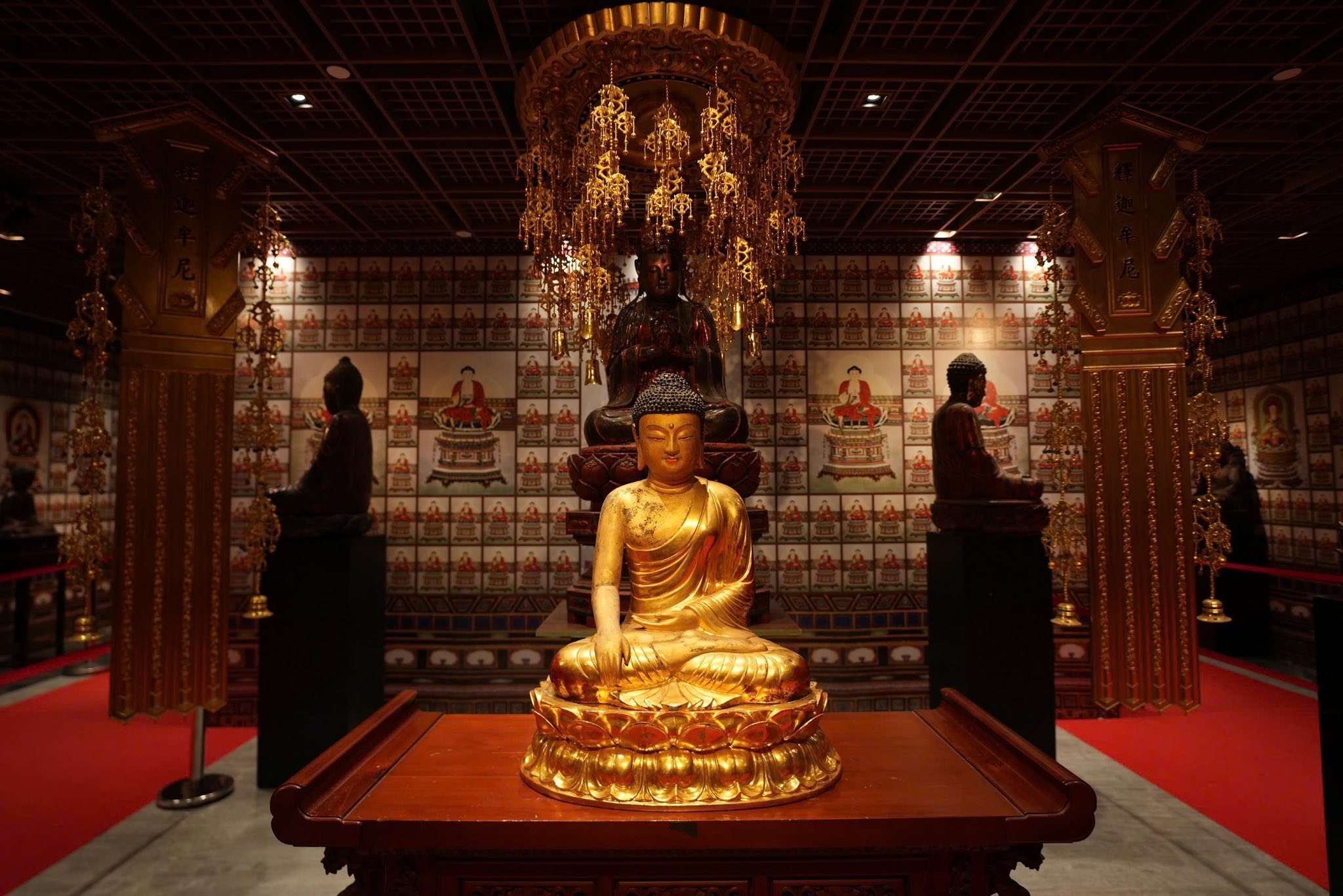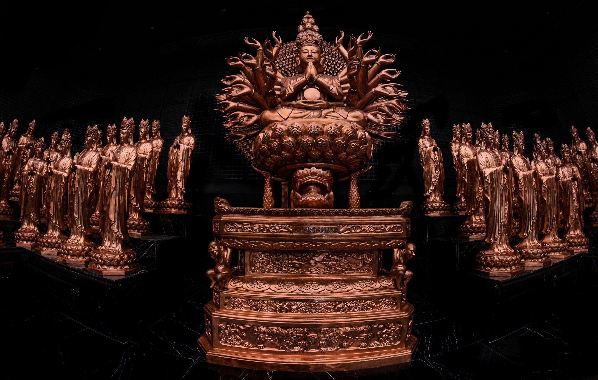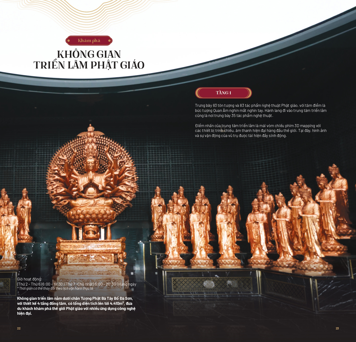 Tổng thể khu trưng bày sử dụng các vật liệu cao cấp như đá granite tự nhiên, đá trắng Ý và đá nâu Tây Ban Nha, mang đến cảm giác giao thoa hài hòa giữa nét cổ điển và hiện đại. Tại đây, du khách có thể chiêm ngưỡng 38 phiên bản mô phỏng các tác phẩm Phật giáo kinh điển của thế giới, tái hiện không gian thờ tự linh thiêng tại Ấn Độ, Thái Lan, Nepal, Pakistan, Tây Tạng…
