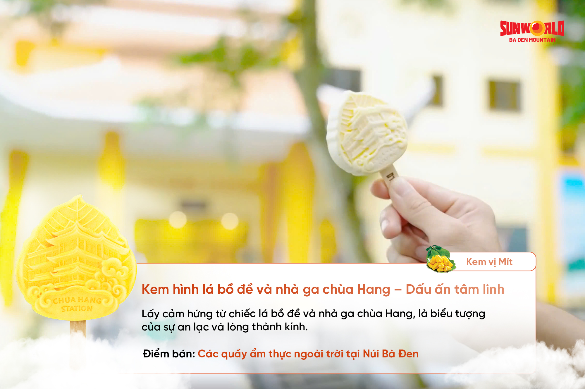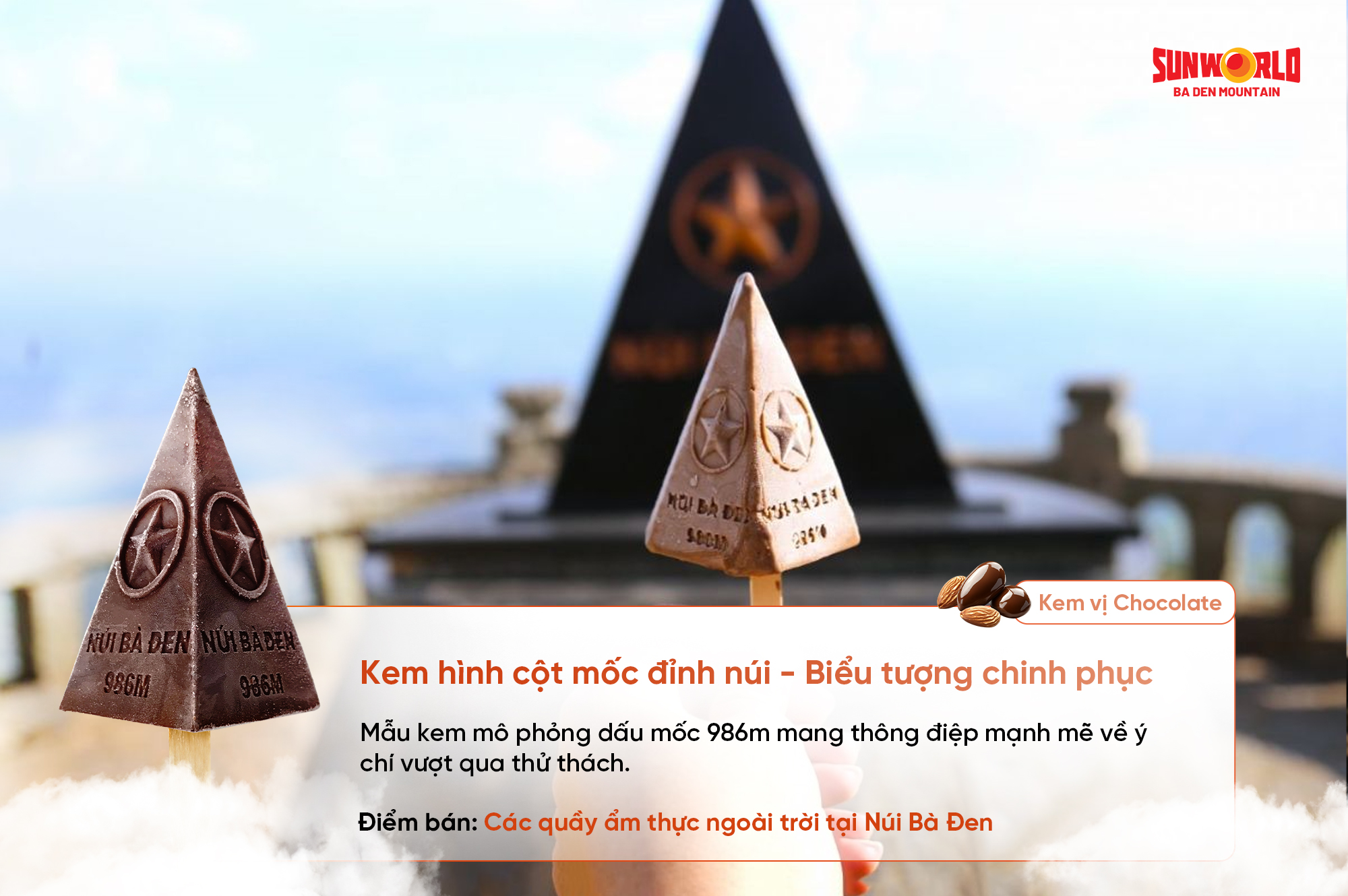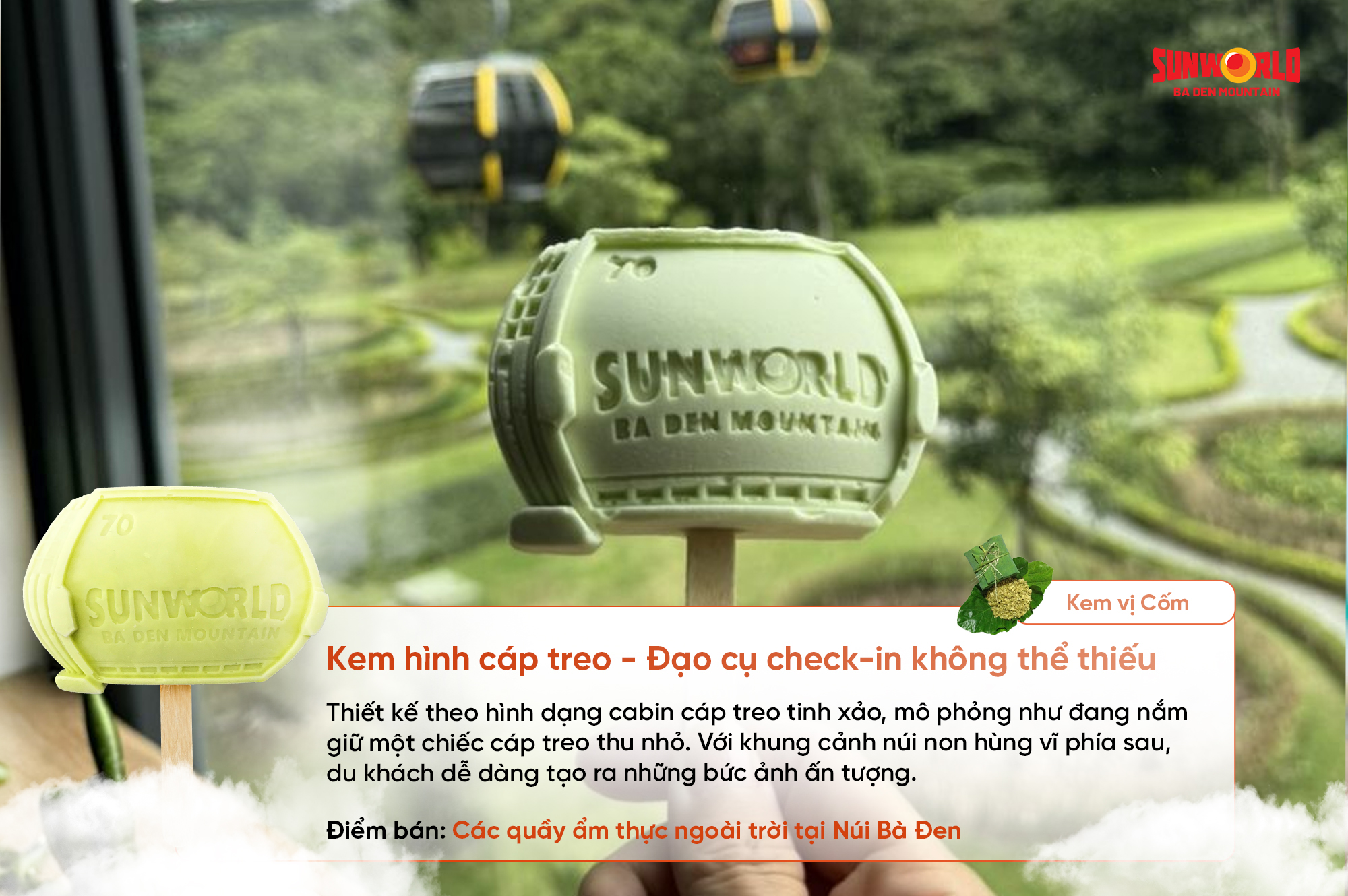 Những que kem núi Bà Đen gây ấn tượng bởi hình dáng độc đáo, sáng tạo cùng hương vị mới lạ, được thiết kế riêng và chỉ có tại Sun World Ba Den Mountain. Đây cũng là một trong những trải nghiệm “must-try” khi check-in đỉnh núi, đặc biệt được giới trẻ và các tín đồ du lịch yêu thích.