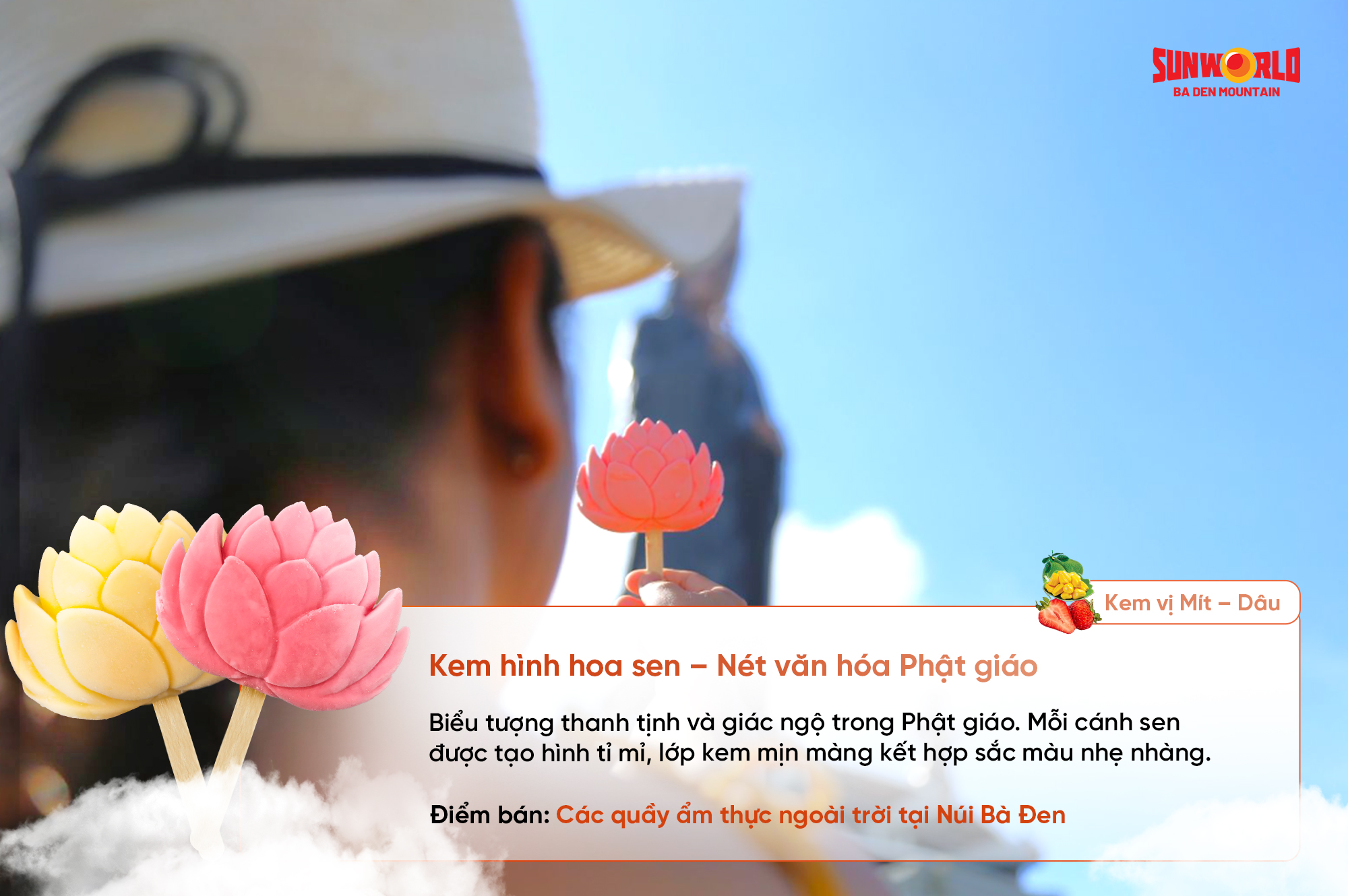 Đến với núi Bà Đen, du khách không chỉ được trải nghiệm cáp treo băng qua biển mây, chiêm bái quần thể triển lãm nghệ thuật Phật giáo thế giới, hay thong dong vãn cảnh tại vườn Vô Ngã rực rỡ hàng ngàn loài hoa, mà còn có cơ hội thưởng thức kem núi Bà Đen – món kem check-in mới đang thu hút đông đảo du khách.