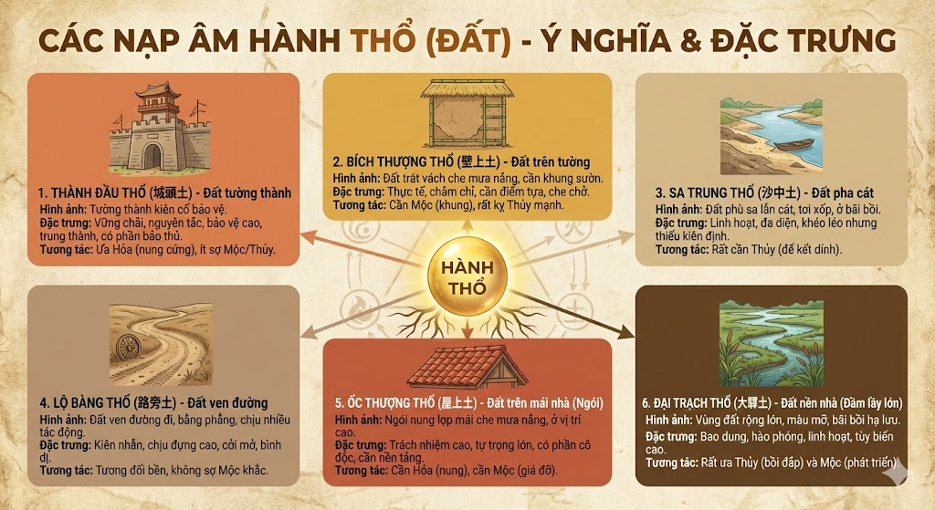 Thành Đầu Thổ – Đất tường thành: Đây là dạng Thổ mang tính chất kiên cố và vững bền. Người thuộc nạp âm này sống rất nguyên tắc, đáng tin và có trách nhiệm. Họ thường trở thành điểm tựa trong gia đình hoặc tập thể nhờ sự ổn định và tính kỷ luật cao.