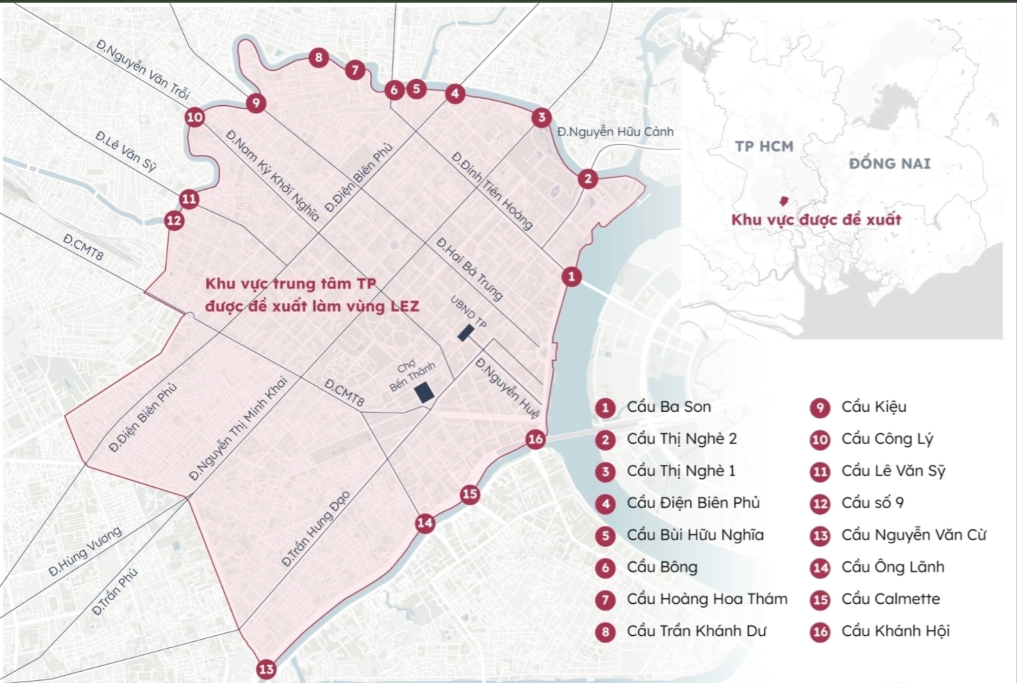 Khu vực trung tâm TP HCM được đề xuất làm vùng LEZ, bao gồm các quận cũ: 1, 3, 5, 6, 8, 10, 11, Bình Thạnh, Tân Bình, Tân Phú và Phú Nhuận, giới hạn bởi hệ thống 15 cây cầu và 17 trục đường chính.