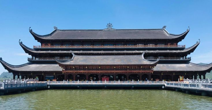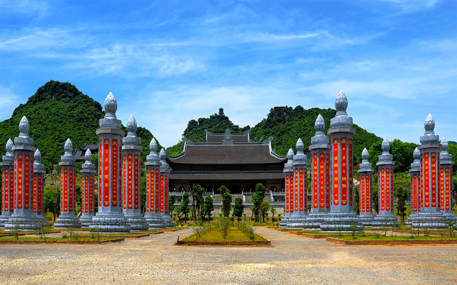 Rời thuyền hoặc xe điện, bạn sẽ bước qua Cổng Tam Quan đồ sộ với kiến trúc hoa văn đặc sắc. Tiếp đến là Vườn Cột Kinh uy nghi với 32 cột đá xanh nguyên khối. Mỗi cột nặng tới 200 tấn, cao 14m. Thiết kế chân đài sen, đỉnh nụ sen và những lời Phật dạy được điêu khắc thủ công trên thân cột tạo nên một không gian vô cùng linh thiêng.