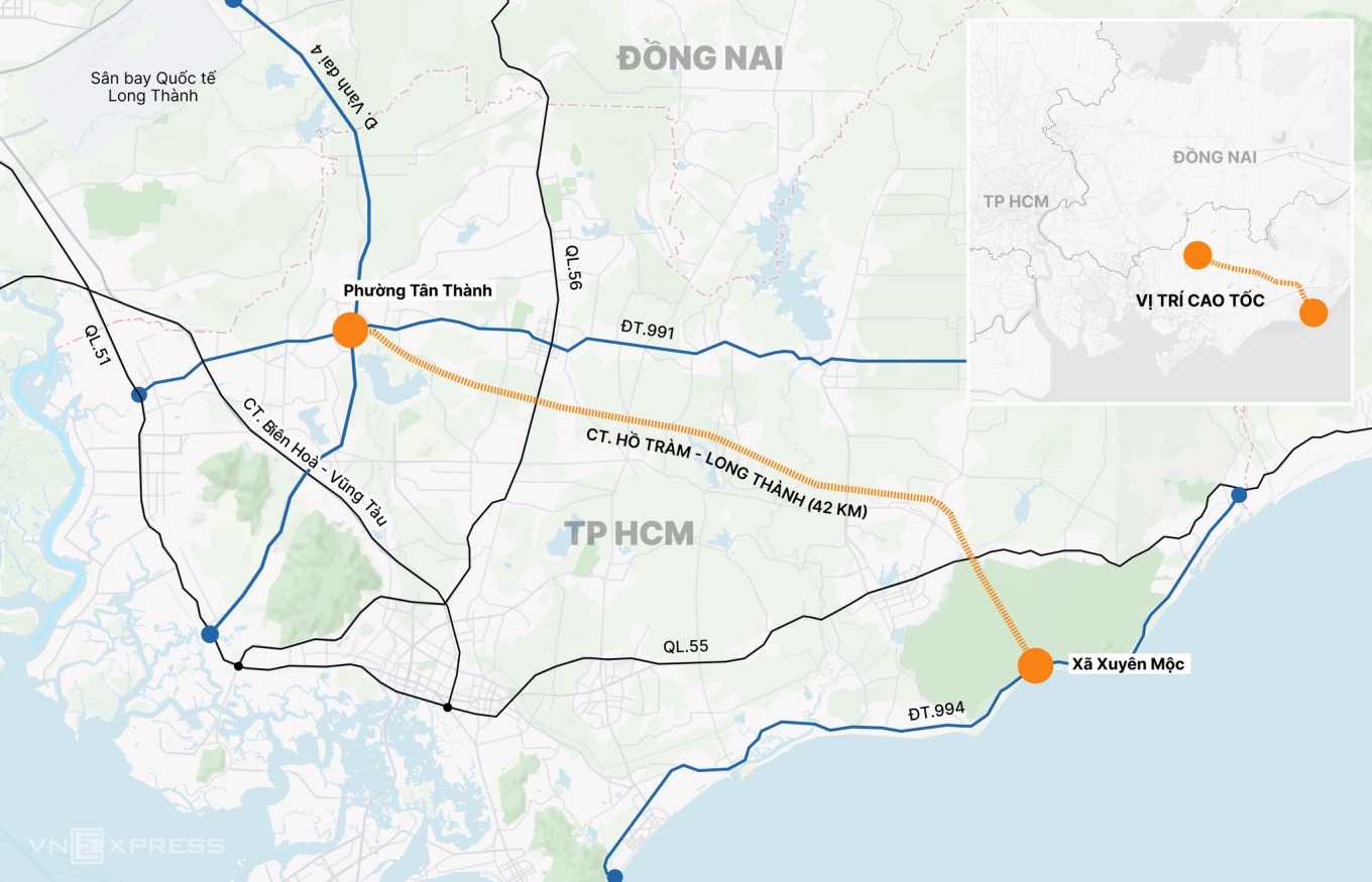 Điểm đầu dự án kết nối với Vành đai 4 TP.HCM và tuyến ĐT.991, trong khi điểm cuối nối với ĐT.994 – trục đường ven biển quan trọng khu vực Hồ Tràm – Bình Châu.