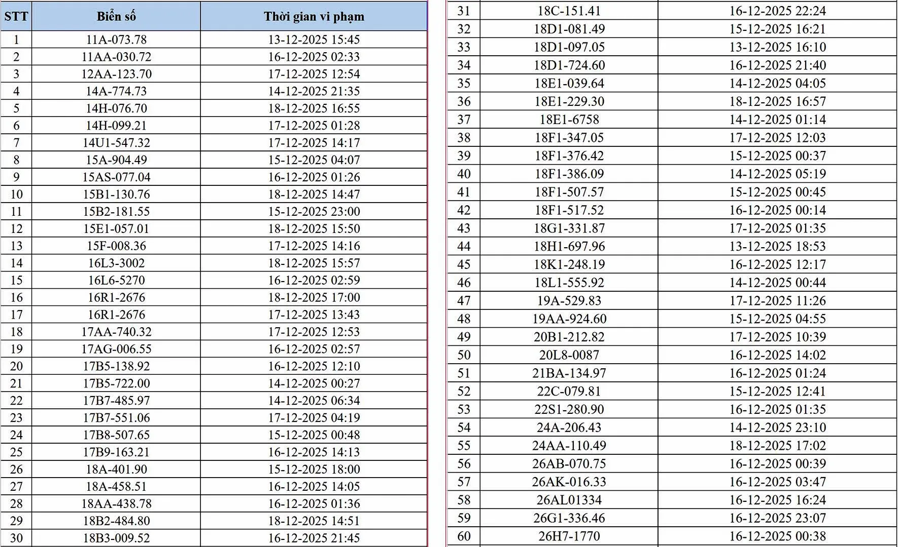 Theo thông tin từ Phòng Cảnh sát giao thông – Công an TP Hà Nội, từ ngày 10/12 đến 18/12, hệ thống camera AI đã ghi nhận và xử lý 545 trường hợp vi phạm (đợt 1). Các thông báo phạt nguội đã được gửi đến chủ phương tiện liên quan để thực hiện nghĩa vụ theo quy định.