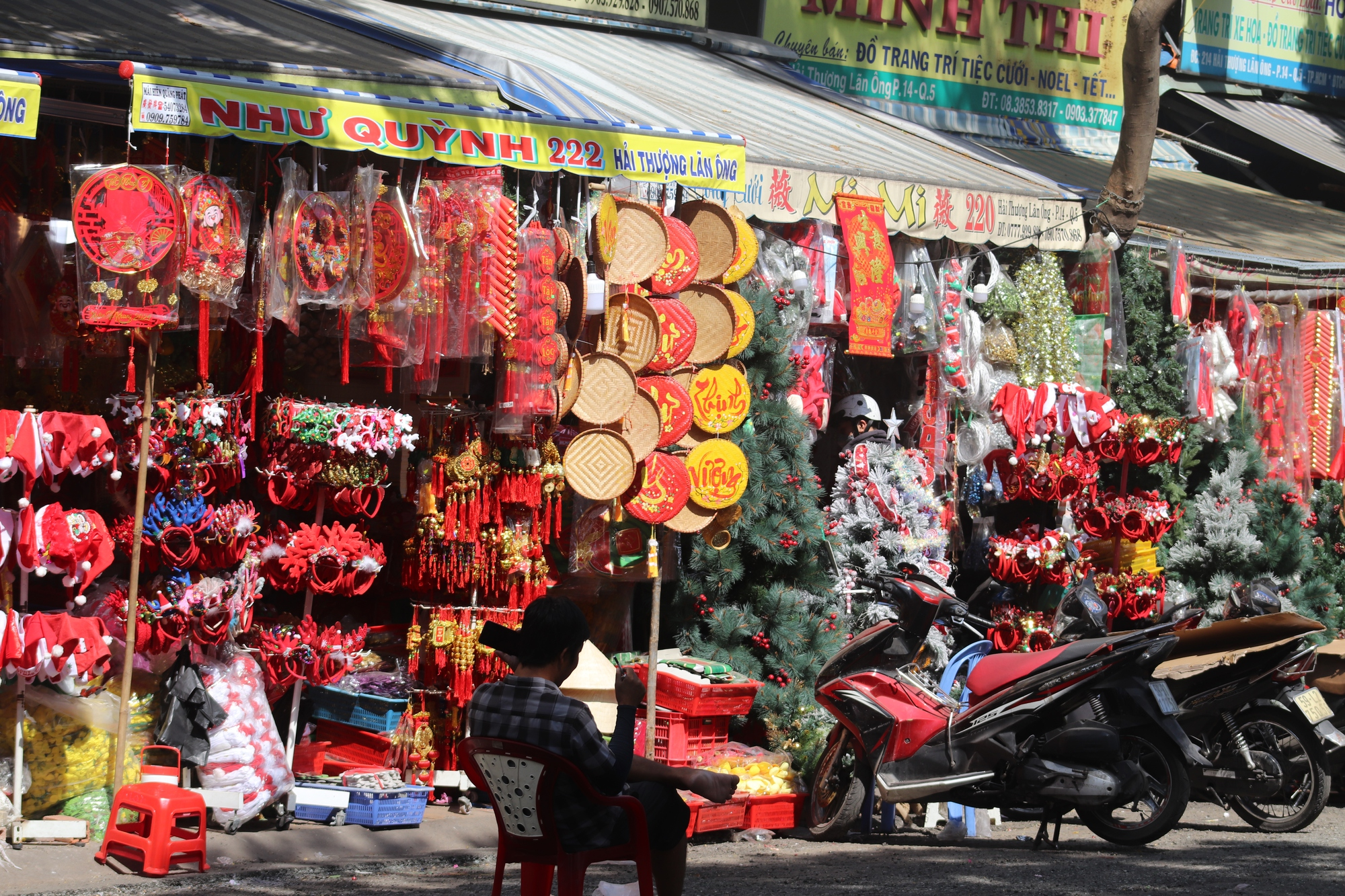 - Đường Hải Thượng Lãn Ông (Q.5): Chợ đêm bán nhiều món phụ kiện Noel, sắc đỏ-xanh rực rỡ.