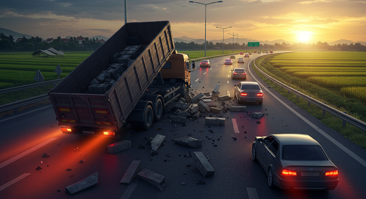 Hàng hóa rơi vãi từ xe tải trên cao tốc là tình huống nguy hiểm và có thể xảy ra bất ngờ. Chỉ trong vài giây, mặt đường khô ráo có thể biến thành lớp trơn trượt như phủ sỏi, khiến phương tiện mất độ bám và dễ xảy ra tai nạn liên hoàn.