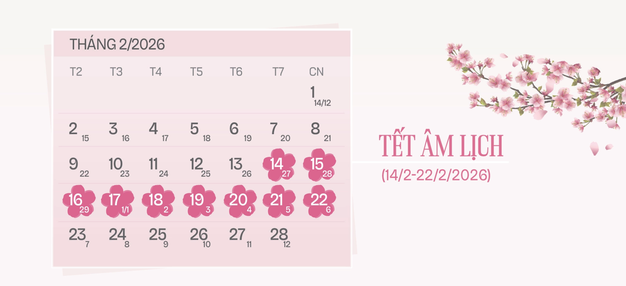 Tết Âm lịch luôn là kỳ nghỉ dài nhất và được mong chờ nhất. Năm 2026 là năm Bính Ngọ (Con Ngựa). Năm 2026, Mùng 1 Tết rơi vào ngày 17/02/2026 (Thứ Ba).