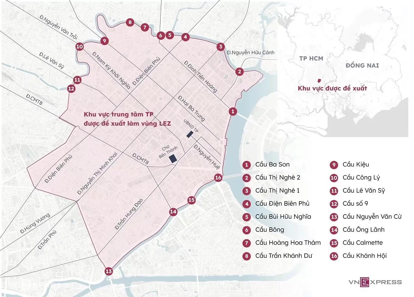 Theo Đề án kiểm soát khí thải phương tiện giao thông đang được hoàn thiện, vùng LEZ sẽ được thiết lập tại khu vực có mật độ dân cư và phương tiện cao nhất TP HCM. Phạm vi dự kiến bao gồm các quận trung tâm cũ như quận 1, 3, 5, 6, 8, 10, 11, Bình Thạnh, Tân Bình, Tân Phú và Phú Nhuận, được giới hạn bởi 15 cây cầu và 17 trục đường chính.