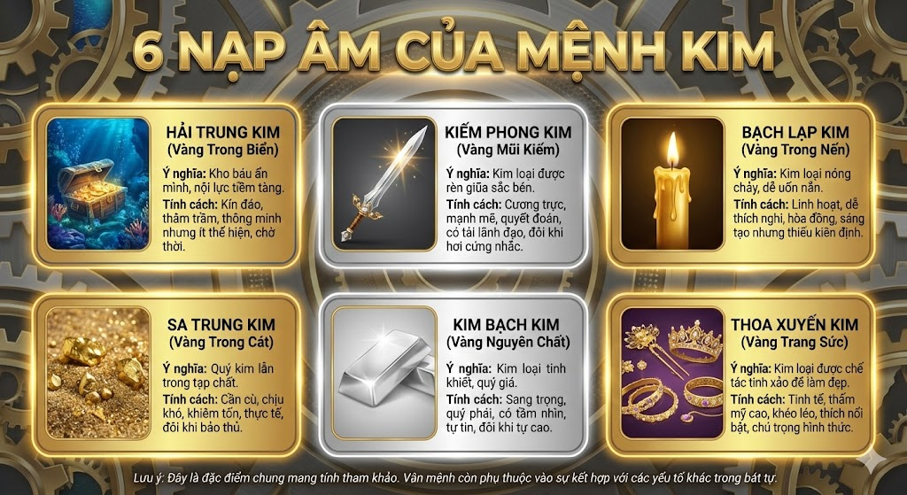 Mệnh Kim đại diện cho kim loại – biểu tượng của sự cứng rắn, sắc bén, dẫn dắt và thịnh vượng tài chính. Trong ngũ hành (Kim - Mộc - Thủy - Hỏa - Thổ), Kim sinh Thủy (kim loại tan chảy thành nước) và được Thổ sinh (đất sinh kim loại). Người mệnh Kim thường thông minh, quyết đoán, nhưng đôi khi cứng nhắc, cần màu sắc để cân bằng năng lượng, mang lại sự linh hoạt và may mắn.