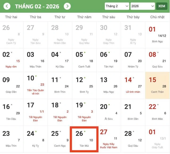 Tra cứu theo lịch Vạn Niên, ngày vía Thần Tài năm 2026 sẽ rơi vào Thứ Năm, ngày 26/02/2026 Dương lịch.