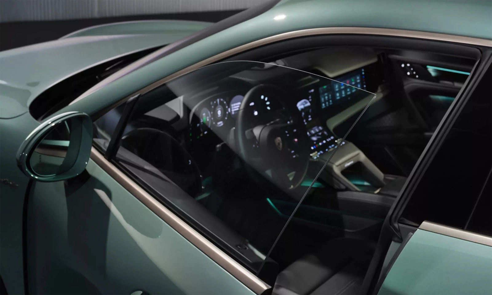 Ngoại thất nổi bật với đèn hậu 3D, logo Porsche phát sáng, nắp ca-pô thấp và kính không khung.