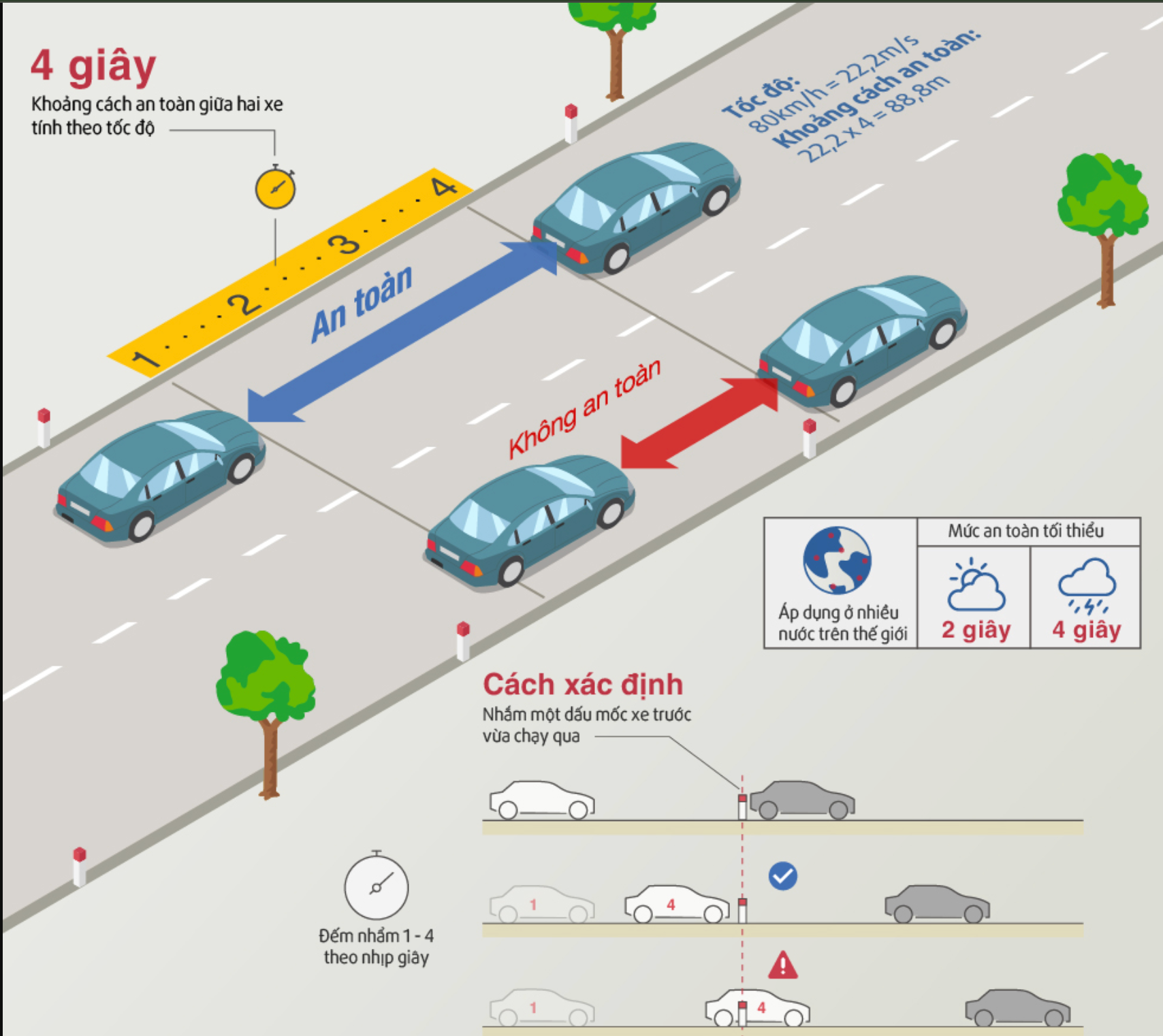 Ví dụ: Trên cao tốc Bắc-Nam, tốc độ 100 km/h, giữ 2 giây ≈ 55m, giúp hạn chế phanh gấp.
