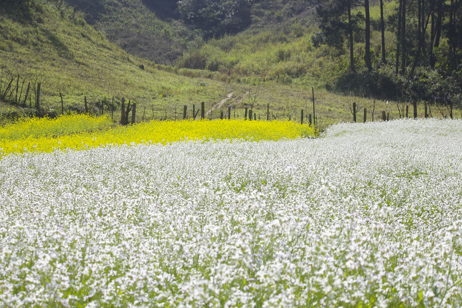 Mộc Châu vào Tết Nguyên Đán ngập trong sắc trắng của hoa cải và hoa mận. Đồi chè trái tim, rừng thông Bản Áng, và thác Dải Yếm là những điểm check-in lý tưởng.