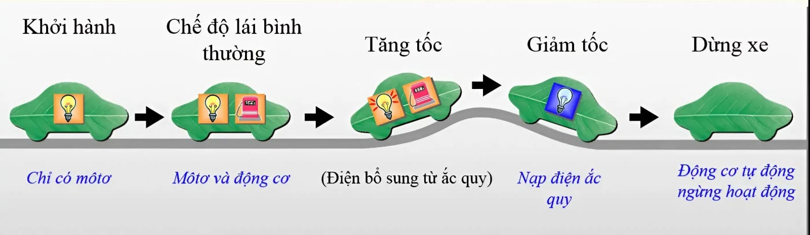 Khi khởi động hoặc di chuyển chậm (dưới 40 km/h), động cơ điện hoạt động chính để giảm tiếng ồn và khí thải. Ở tốc độ cao hoặc tải nặng, động cơ xăng sẽ tham gia, đồng thời sạc pin qua quá trình tái tạo năng lượng. Tính năng tái tạo năng lượng khi phanh là điểm nổi bật, biến năng lượng dư thừa thành điện lưu trữ, giúp tiết kiệm đến 15-20% nhiên liệu theo dữ liệu từ Bộ Giao thông Vận tải Việt Nam.